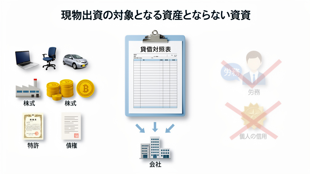 一方で、労務(労働力の提供)や個人の信用(有名であること等)は、資産としての評価や譲渡ができないため、現物出資の対象にはなりません。
