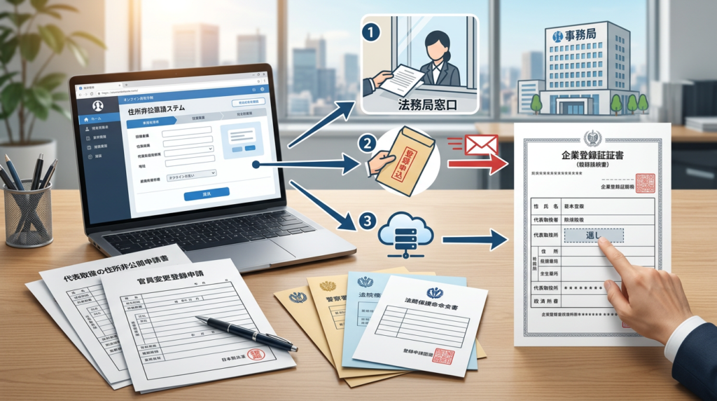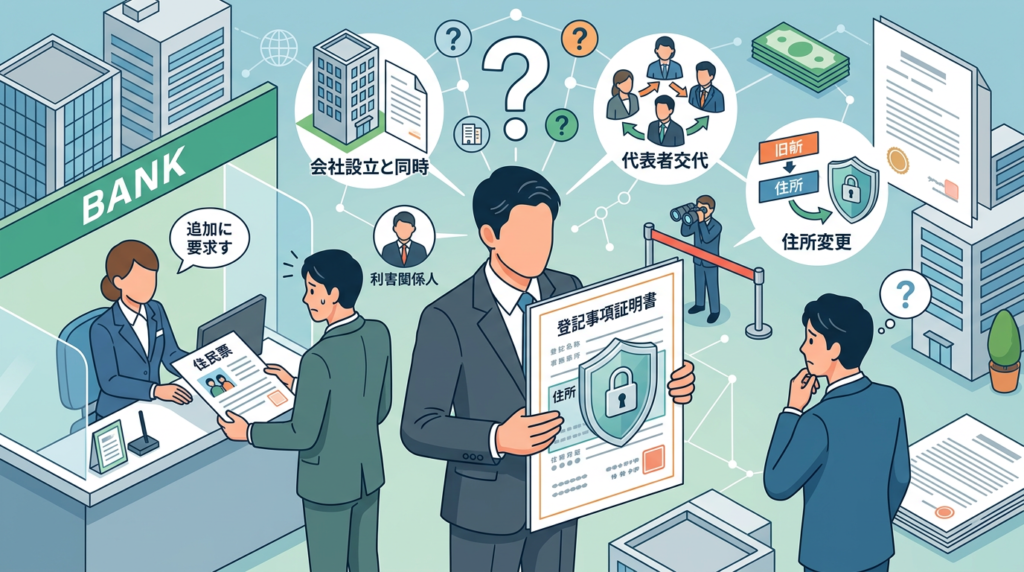 | 金融機関での手続き | 銀行口座の開設や融資の申し込み時には、犯罪収益移転防止法に基づき、代表者の本人確認書類(運転免許証など住所が記載されたもの)の提出が必須です。非表示措置を利用していても、銀行には住所を開示する必要があります。 |