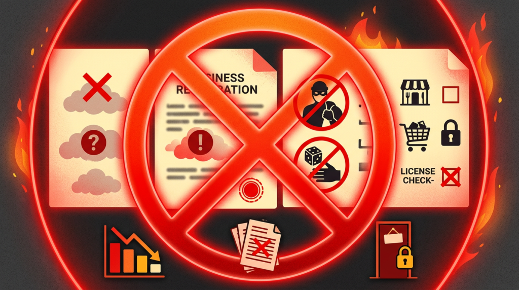 法務局の登記官が審査する段階で、違法または不道徳な事業目的と判断されれば、登記申請は却下されます。